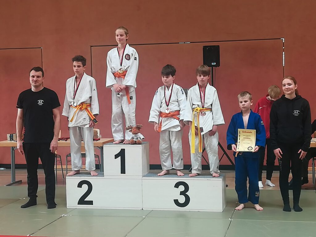 Am Nachmittag war dann unsere U13 dran. Arno hat, wie immer, seinen ersten Kampf verschlafen. Im Training zeigt er gute Techniken. Leider werden diese aber von ihm im Wettkampf nicht umgesetzt. Es wäre eine Platzierung für ihn drin gewesen. Leider verlor er, wieder durch eine Unachtsamkeit, den Kampf um Platz drei und war somit raus. Lean, in derselben Gewichtsklasse am Start wie Arno, ließ nichts anbrennen. Durch sehenswerte Kombinationen und Angriffe setze er sich souverän bis ins Finale durch. Auch dort konnte er mit sehr schönen Angriffen den Gegner aus Königs Wusterhausen aus dem Konzept bringen. Mit einer sehr schönen Seoi Nage war dann Platz eins sicher.